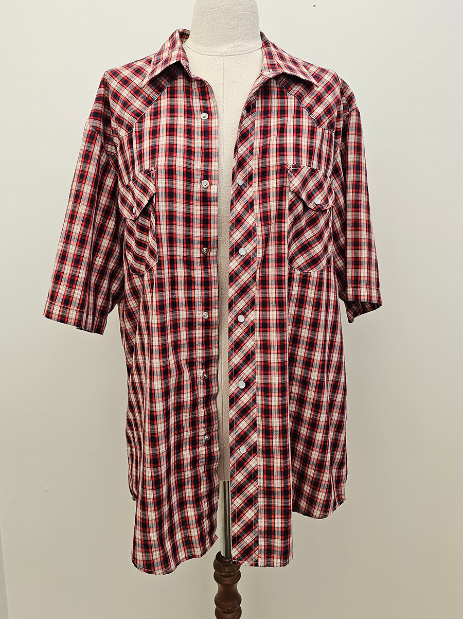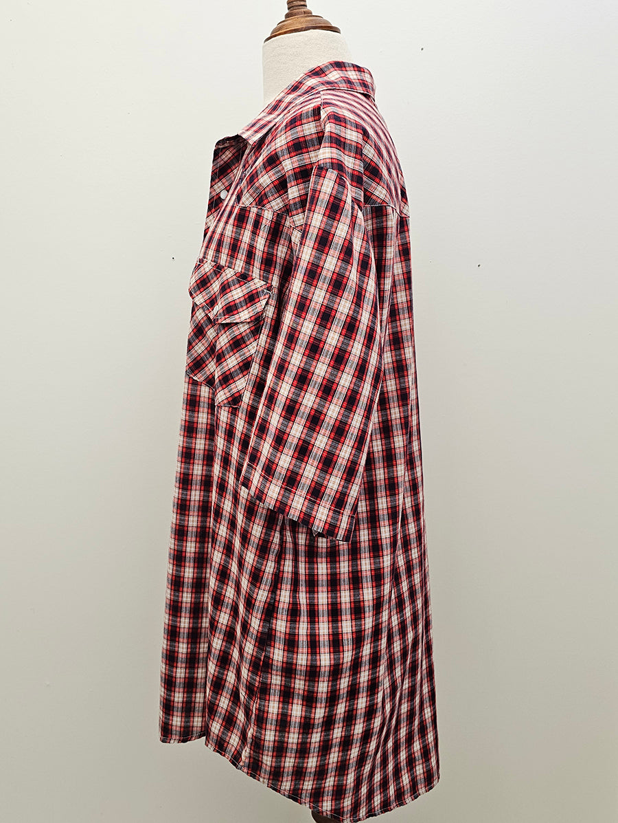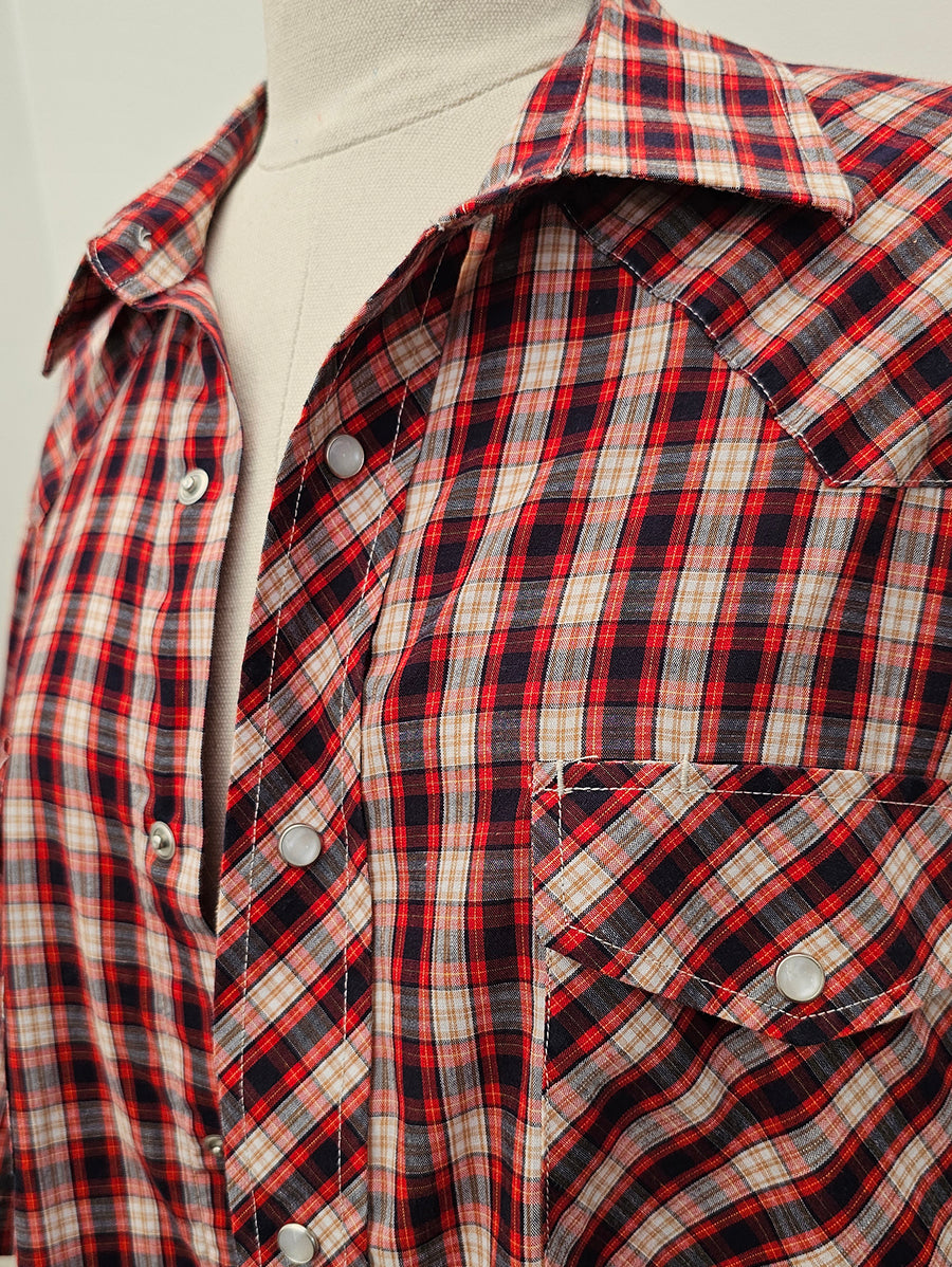 Classic Red tartan western shirt featuring front pockets, shaped yolks and pop domes.