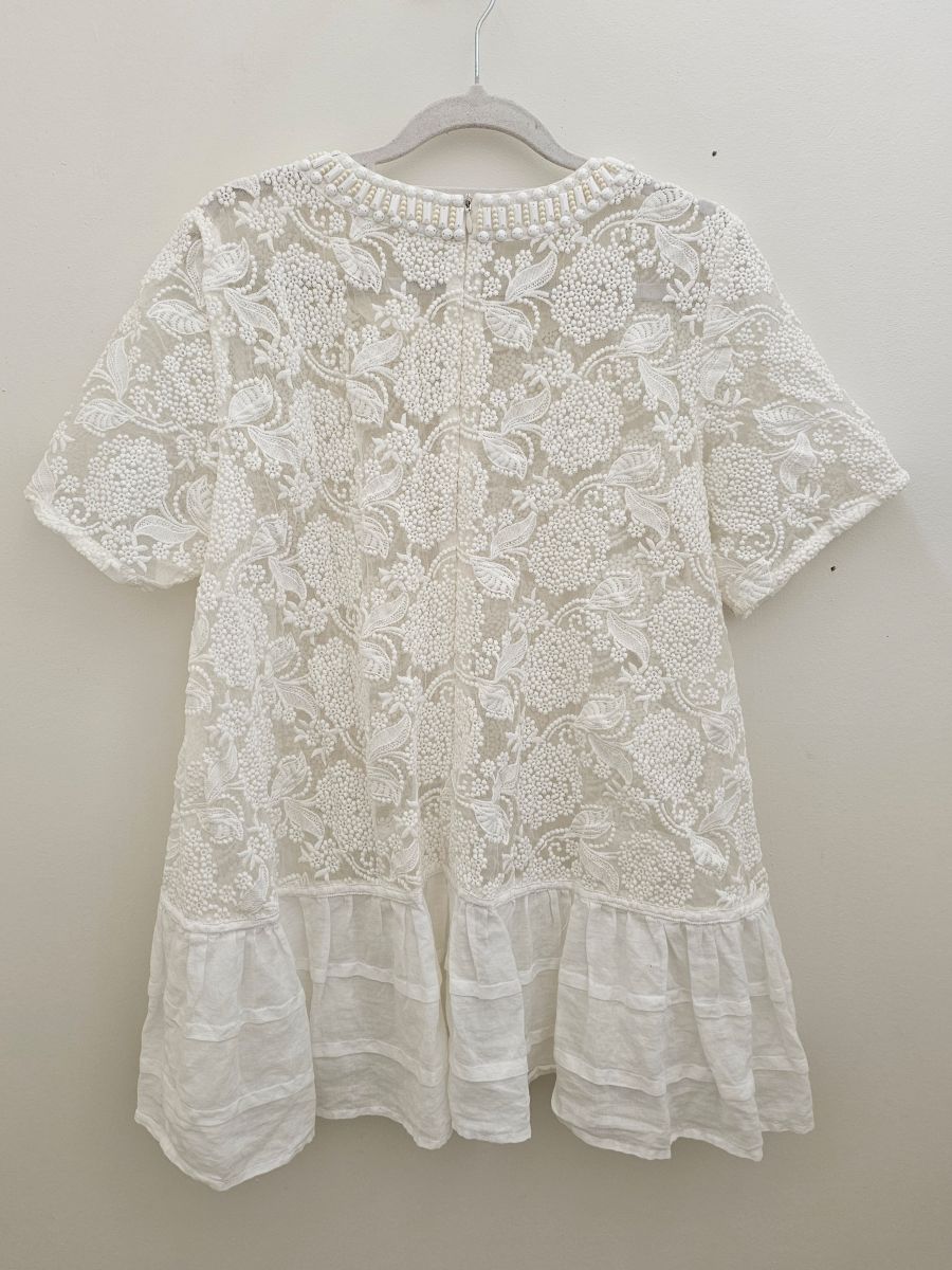 Sheer with beaded detail and a ruffled linen hem.