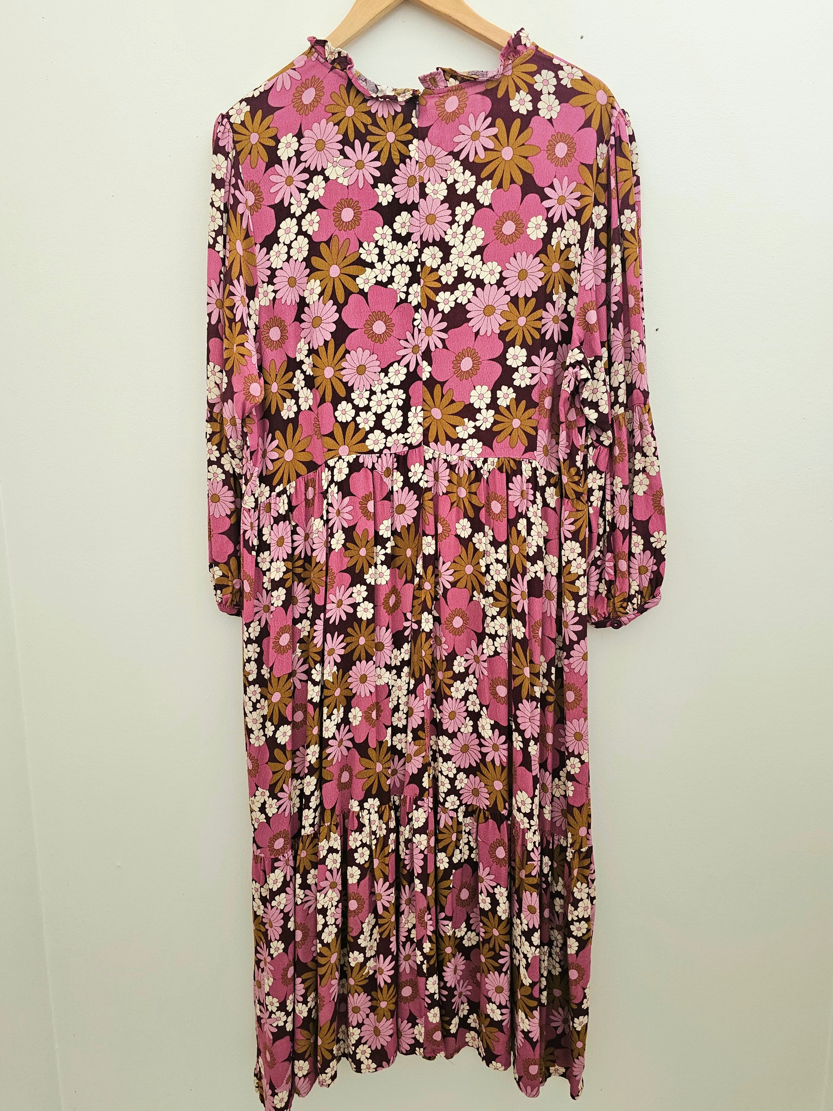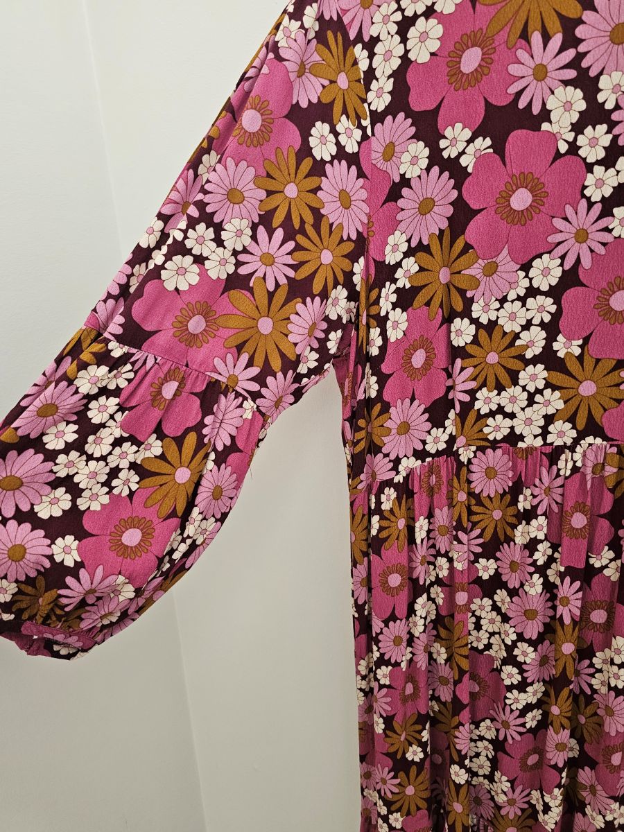 Such a fun retro floral print in browns and pinks. Such a great pop of colour.